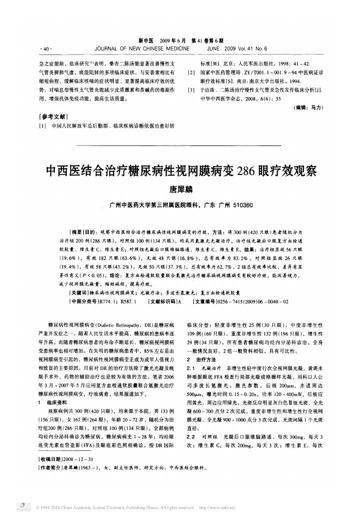 中西醫結合治療糖尿病性視網(wǎng)膜病變286眼療效觀(guān)察