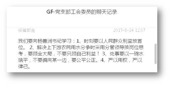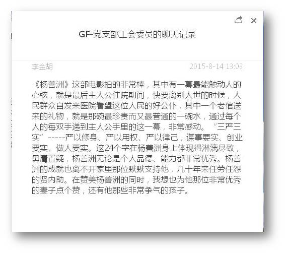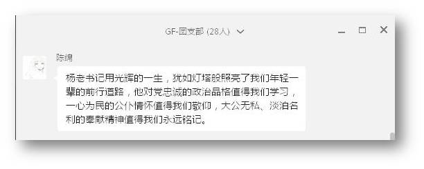 ?會(huì )后,廣發(fā)全體員工積極發(fā)表自己的想法和體會(huì ),黨團員工會(huì )會(huì )員以?xún)蓚€(gè)微信群為平臺,進(jìn)行了熱烈的討論。龐天秀、李婷率先發(fā)表了體會(huì ),陳翰金、朱鵬深有感觸地表達了要實(shí)現夢(mèng)想,必須要向楊書(shū)記學(xué)習的理念。在兩個(gè)主持人的認真主持下,周樹(shù)和、洪鳳玲、周亞林、葉振發(fā)、鄧紫珊、陳綿、唐玄甄、黃瑤瑤、莫海琳、黎順弟、黃賢芳、鄧思麗、李明亮、葉正豐等等同志,都認真參與了討論;充滿(mǎn)了正能量。還有實(shí)習生翟官棋同學(xué)也向黨支部交了觀(guān)后感。我們熱烈歡迎大家在不影響工作的前提下充分利用時(shí)間參與討論;我們相信會(huì )有更多的同志像葉沛權同志那樣起到帶頭、帶動(dòng)作用;我們決心充分利用微信平臺,把三嚴三實(shí)教育活動(dòng)不斷引向深入!