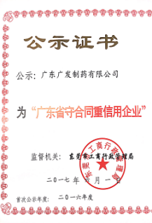 近日,東莞市石碣鎮工商分局公布了石碣鎮入圍2016年度廣東省“守合同重信用”企業(yè)名單,廣東廣發(fā)制藥有限公司榮列其中。