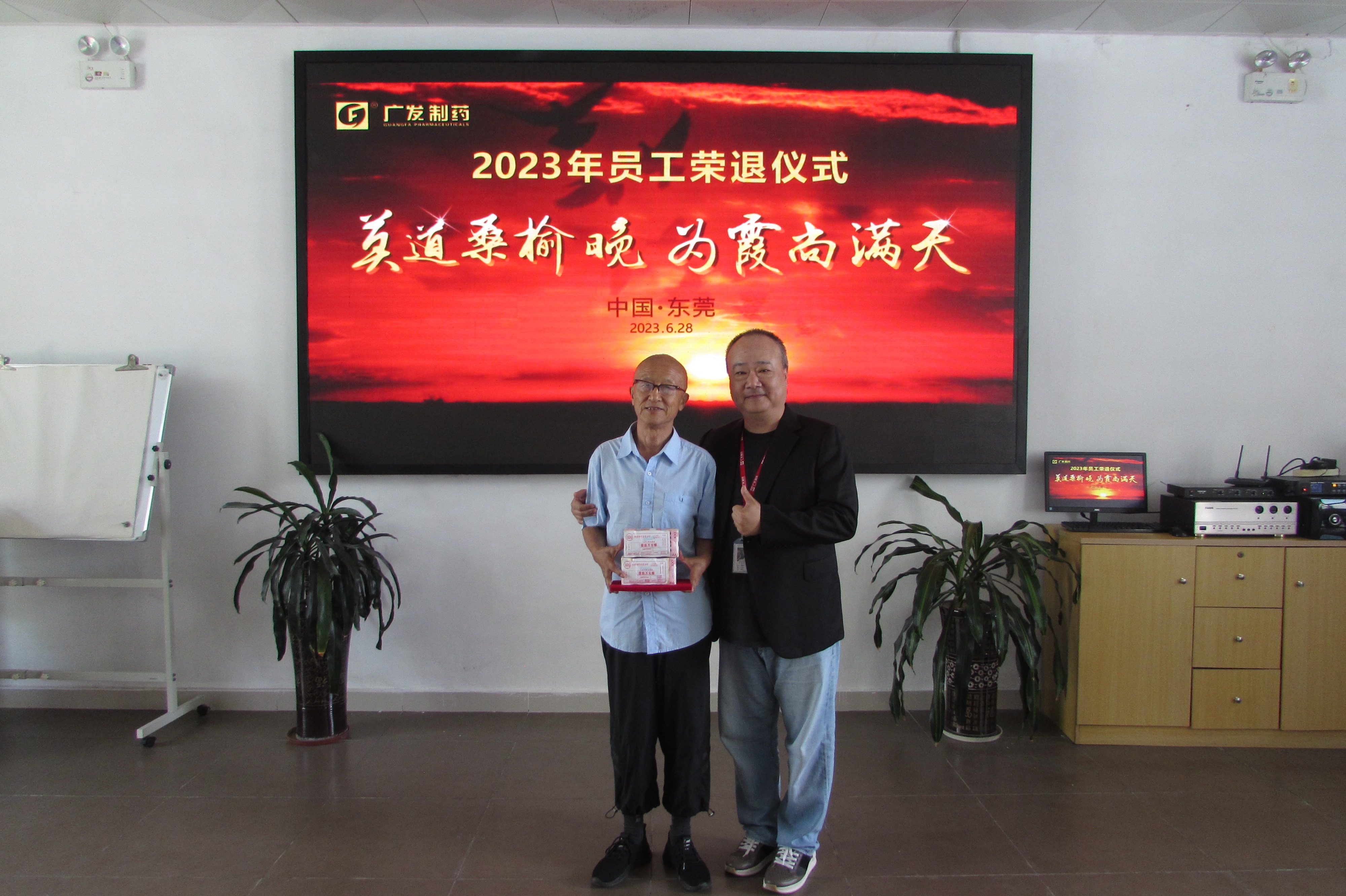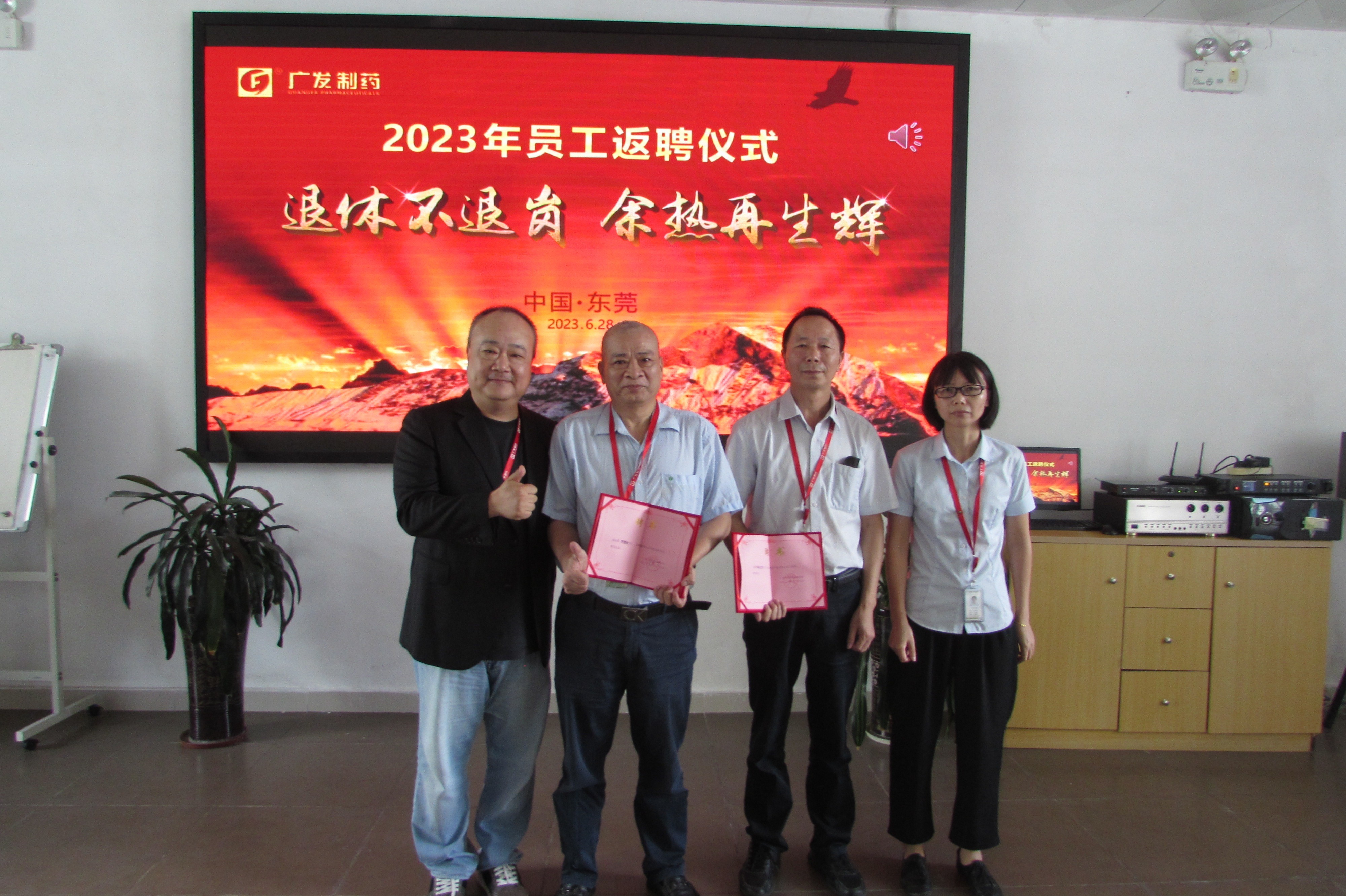 憶往昔,并肩創(chuàng )業(yè)長(cháng)路漫漫;念此時(shí),重逢片刻來(lái)去匆匆。6月28日,廣發(fā)制藥榮譽(yù)退休返聘儀式在悠揚的《送別》歌曲聲中拉開(kāi)了序幕,公司全體員工以最誠摯的情誼歡送安天祥、李渡春、鐘耀清、陳小芳、梁麗珍5名同事光榮退休。集團公司董事長(cháng)張董、公司高管團隊以及全體員工代表參加此次儀式。